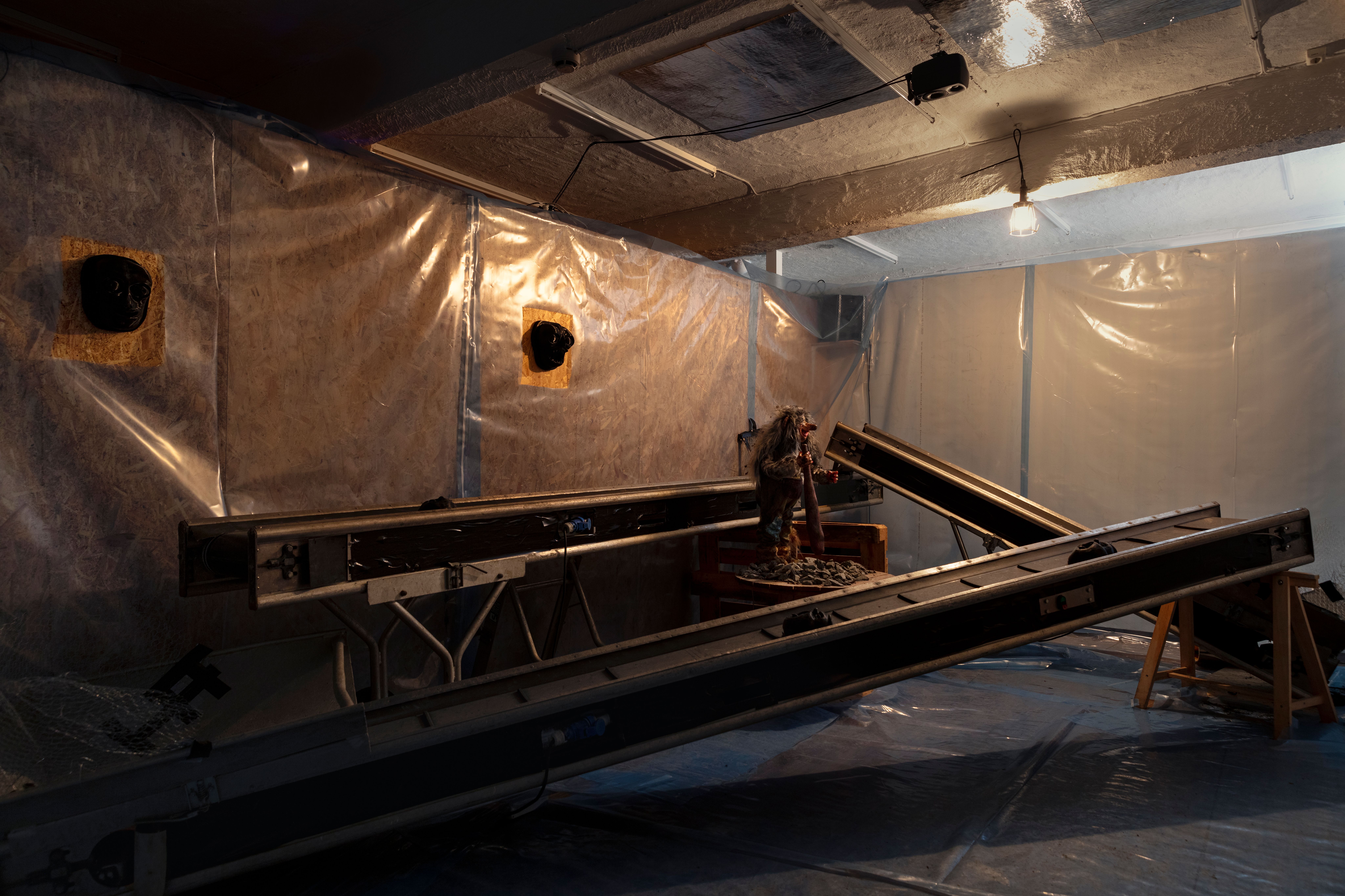 Litt off er det også på Galleri Melk om dagen. I galleriet, som ligger i en rolig sidegate opp mot 'haugen, har kunstner Emil Finnerud dekket veggene med mørk filt. På gulvet ligger steiner og togskinner som løper innover før sporet tar en liten sving, og ender opp i et rom hvor det står et mekanisk troll av typen vindusutstilling-på-turistbutikk og veiver med en stav. Rundt trollet går et system av samlebånd, som er vinklet slik at det som ligger oppe på båndene faller skranglende ned fra det ene til det andre i en evig runddans. Og det som ligger oppå dem? 3D-printede avstøpninger av ansikter ...