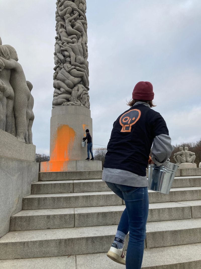 Det slår et barnehagebarn fast. Like før har to aktivister fra Stopp Oljeletinga gjennomført enda en kunstaksjon. Oransje maling renner nedover trappetrinnene som fører opp til Gustav Vigelands Monolitten, som har fått maling på sokkelen.